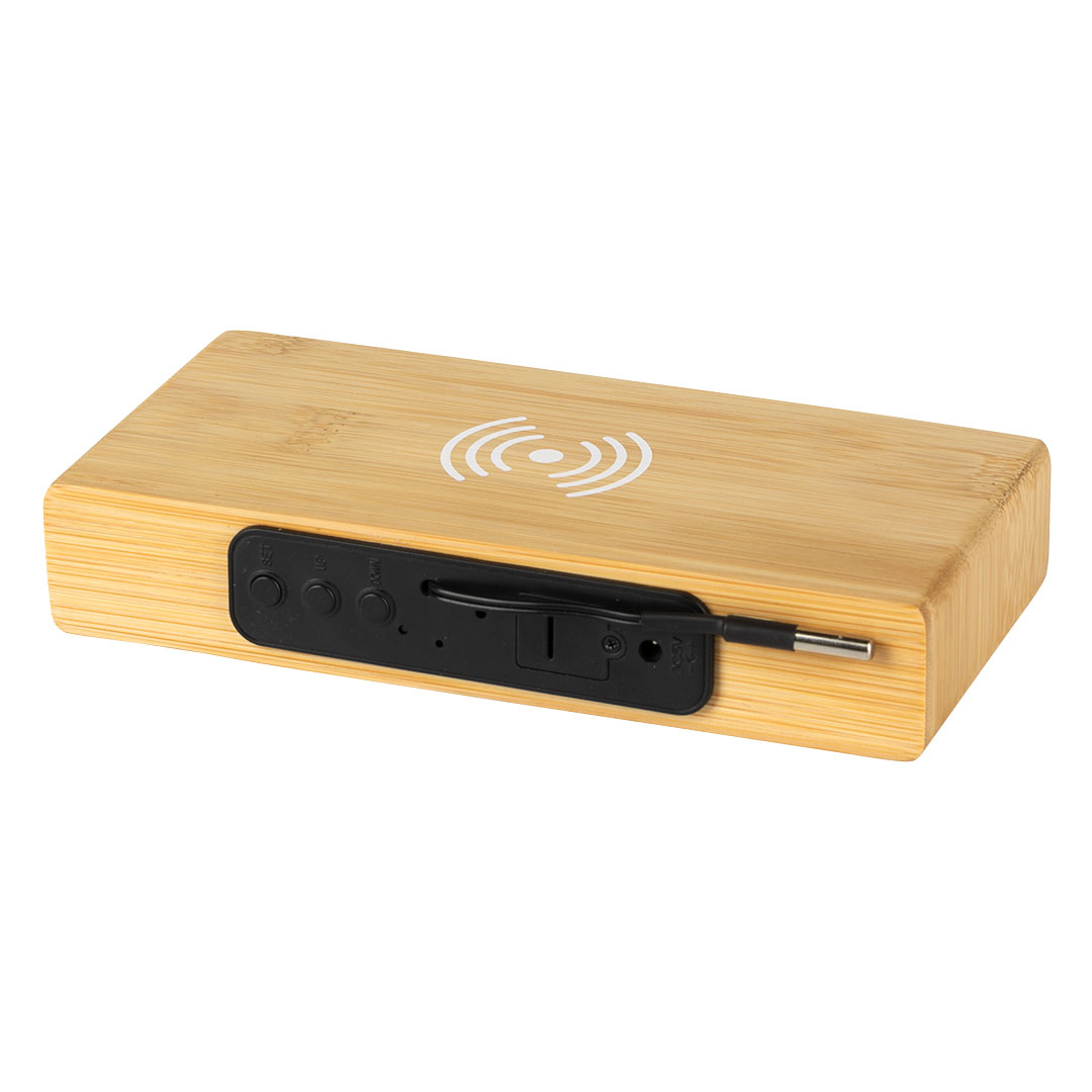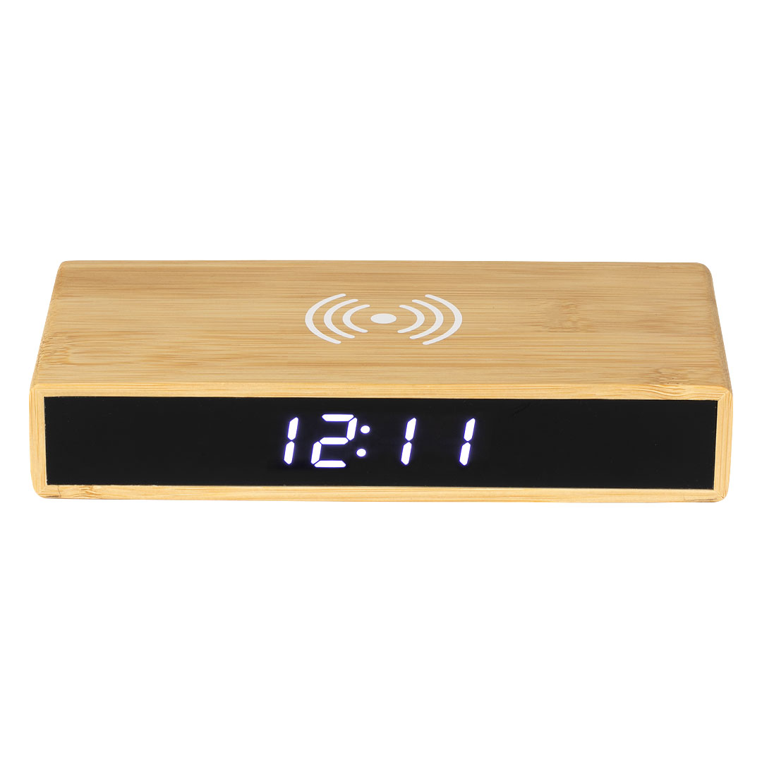 Digitalni stoni LCD sat sa bežičnim punjenjem, 5W Description: Nature line, LCD multifunction watch with integrated 15W wireless charger. Made of bamboo obtained from natural cuttings. Date and time function, alarm, and thermometer. Power supply via USB