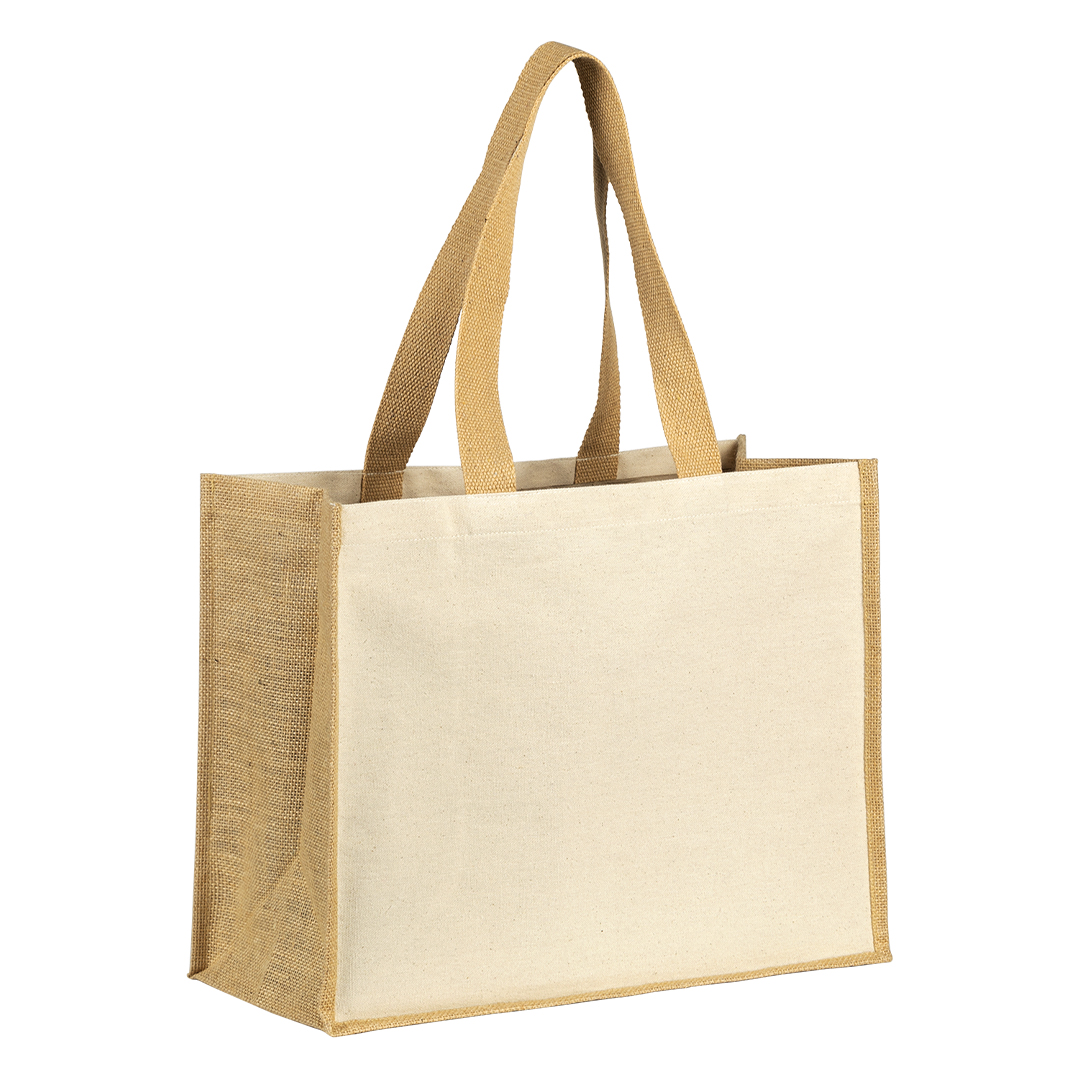 Materijal: bočne strane i dno – juta, prednja, zadnja strana i ručke – pamuk